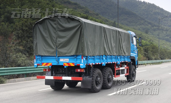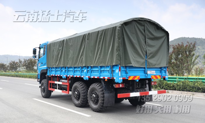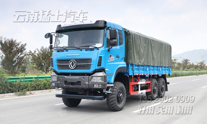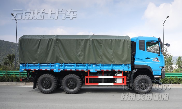東風(fēng)六驅(qū)340馬力出口專用卡車,全車總質(zhì)量達(dá)25噸,為應(yīng)對長途行駛,安裝有大容量剎車降溫水箱,可以在長時間行駛時(或惡劣路段,長時間使用剎車時)為輪轂降溫,以及日常用水。配備有可拆卸的蓬布篷桿,可以保護(hù)車內(nèi)貨物免受風(fēng)沙雨水淋濕。