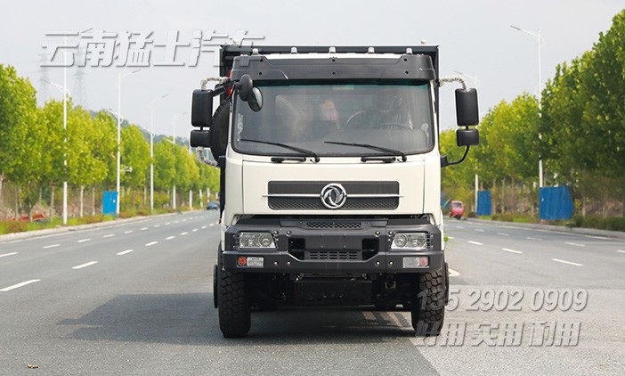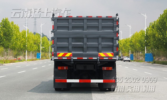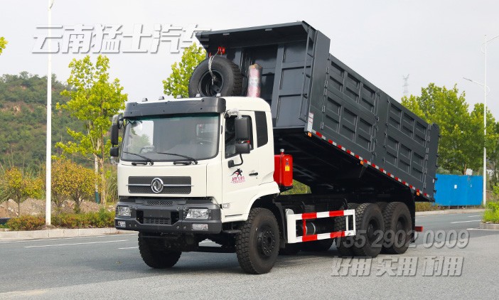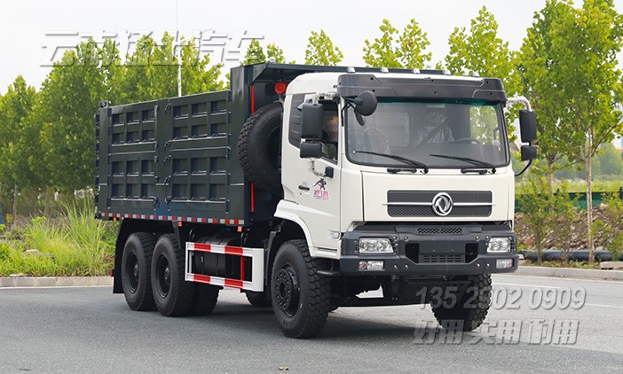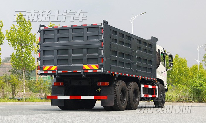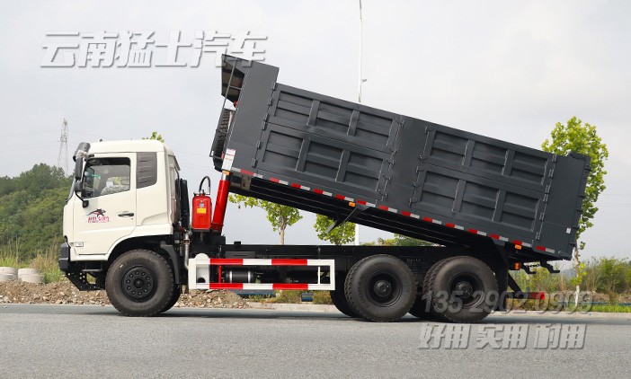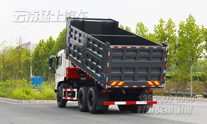 東風(fēng)6*4后八輪重型自卸車采用玉柴340馬力發(fā)動(dòng)機(jī),貨箱舉升可不掛檔,最大承載20噸貨物。貨箱邊5底6,五開(kāi)門,后門中門。