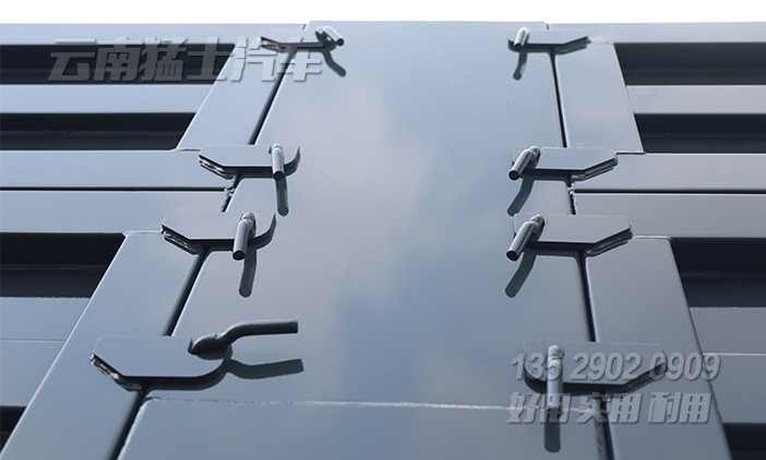 邊板田字格花紋,左右邊板可開(kāi)啟。備胎安裝在駕駛室與貨箱之間,有專用備胎升降機(jī)構(gòu)。