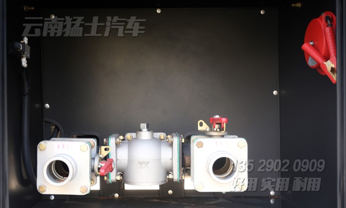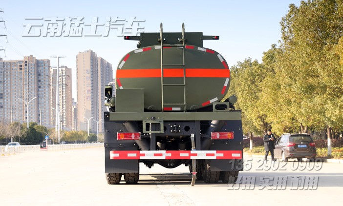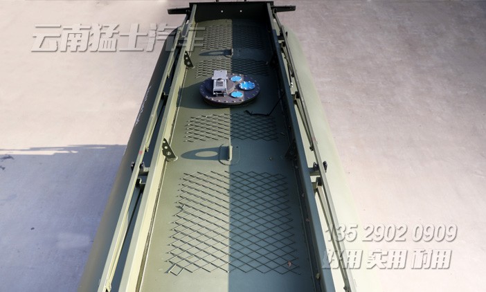 車尾帶有爬梯,可以通往罐體頂部。罐體頂部平臺兩側帶有折疊安全扶手,罐體頂部中間帶有歐標加油口,罐體內安裝2道阻浪板,隨車還配有油罐。