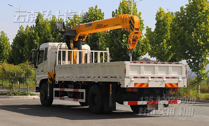 隨車起重運(yùn)輸車也稱作隨車吊,4x2東風(fēng)8噸隨車吊安裝徐工8噸四節(jié)臂直臂吊機(jī),可360°旋轉(zhuǎn),帶有后液壓支腿和上操功能。