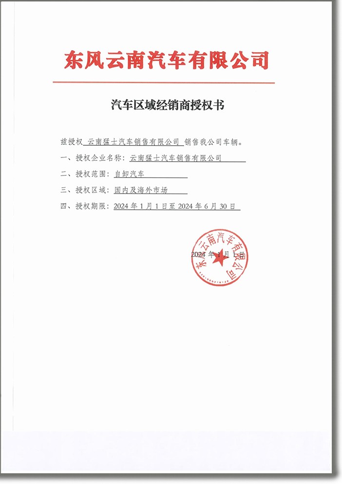 2024年東風(fēng)云南汽車有限公司授權(quán)書