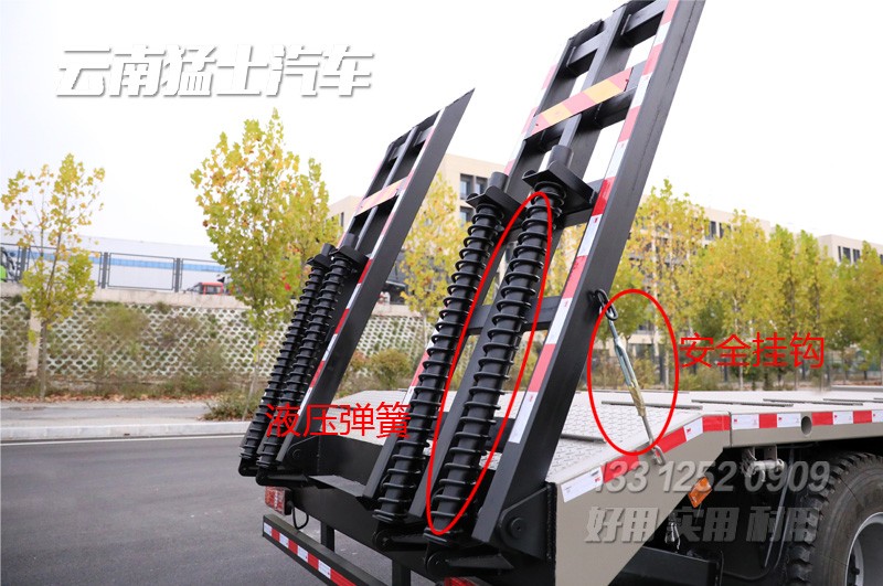 Q:車尾的爬梯也叫做挖機板,是通過手動翻轉(zhuǎn)的方式,將爬梯放到地面,其他車輛可以通過爬梯開到平板上,在運輸車輛時非常關(guān)鍵。爬梯翻轉(zhuǎn)采用彈簧液壓結(jié)構(gòu),同時配有安全掛鉤,省力又安全。