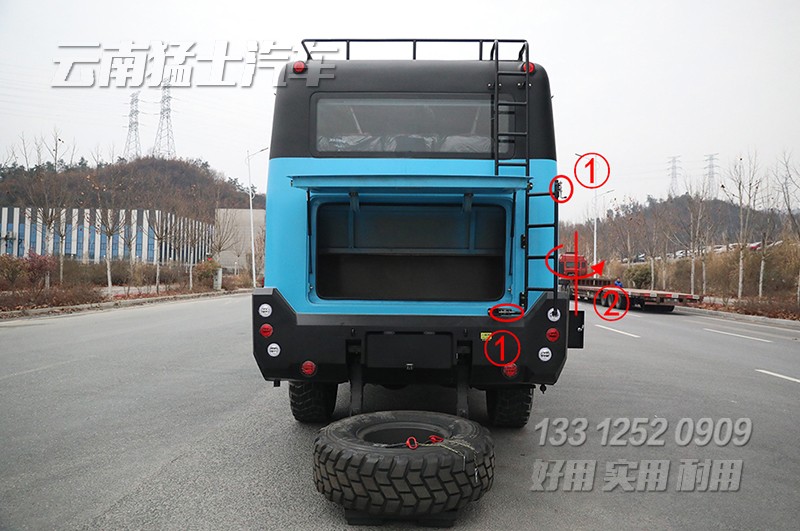 ? ? ? 作為一款可在惡劣路段下行駛的六驅(qū)越野客車,強大的越野性能靠的是多種強力配置的組合,其中輪胎也至關(guān)重要。該車采用12.5R20越野鋼絲輪胎,該輪胎比常規(guī)的輪胎相比要大,這樣可以一定程度上增大車輛的最小離地間隙和接近角離去角,同時內(nèi)部含有鋼絲,讓該輪胎的使用壽命和耐磨程度得到提升,不過相應(yīng)的也更重。在行駛過程中如輪胎發(fā)生故障需要更換,將變得不方便,所以我公司為該車設(shè)計了專用備胎架,方便備胎的裝卸。