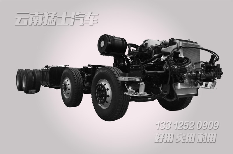 該底盤(pán)采用了玉柴420馬力發(fā)動(dòng)機(jī),軸距1850+4650+1350mm,前橋雙5噸,后橋雙10噸,最終將改裝成一輛平板運(yùn)輸車(chē)。