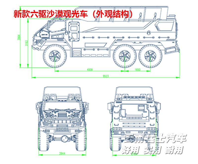 ? ? 底盤方面,發(fā)動機(jī)采用德國man 640馬力發(fā)動機(jī),美國艾里遜變速箱(可選自動檔),奔馳同款氣囊減震懸架,車橋采用北奔全驅(qū)車橋,總承載力達(dá)28噸。巨大的28L-26的沙漠專用輪胎,等人的高度,讓該車顯得無比高大,額外吸引眼球。越障、涉水、爬坡等越野參數(shù)對于沙漠車來說是入門證書,不僅可以馳騁沙場,也可以暢行綠洲。